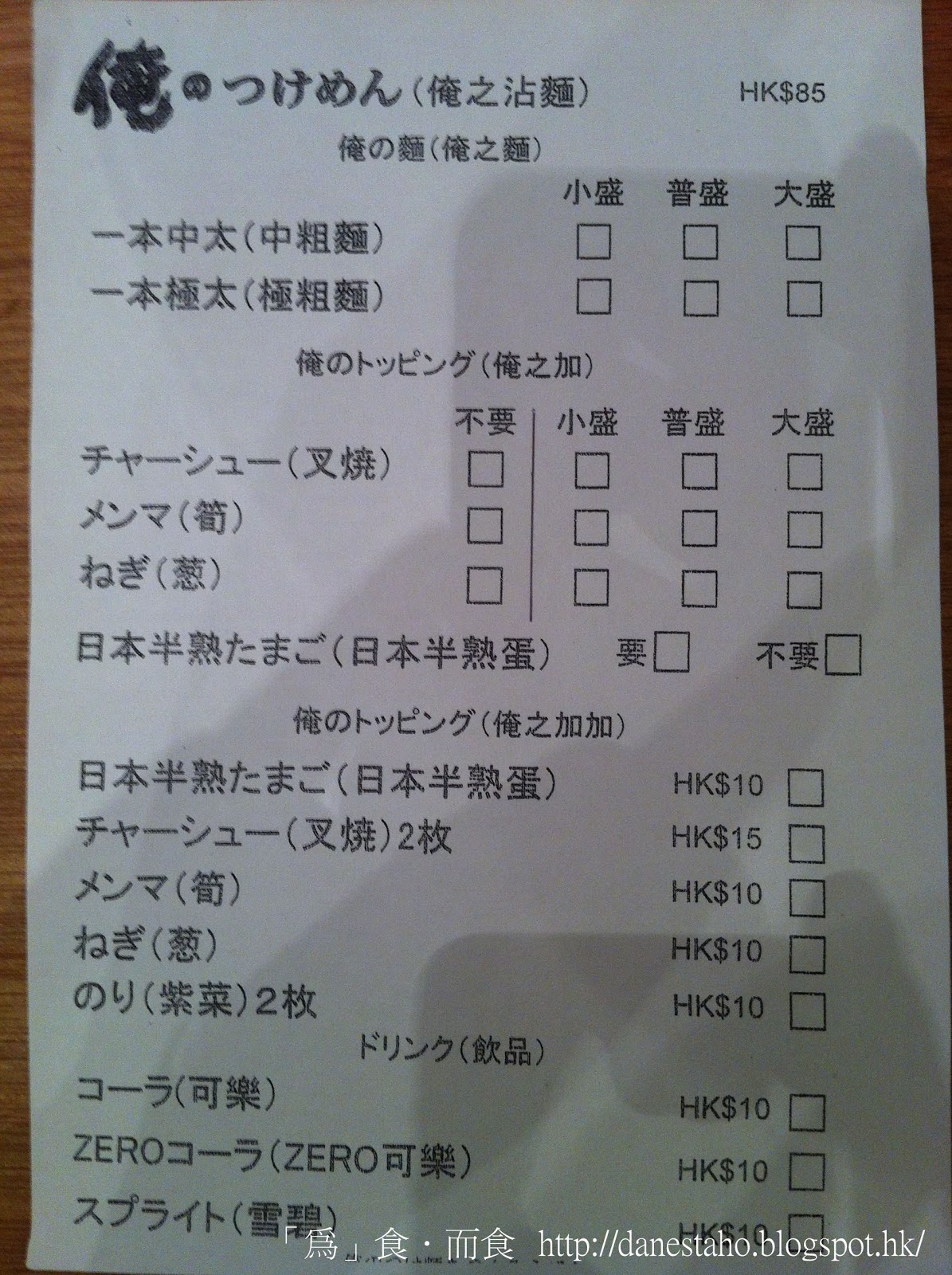 這裡不會像坊間的沾麵店有不同口味選擇,賣的就是一種口味(俺之麵),麵可以選擇一本中太(中粗麵)和一般的拉麵粗幼相若,一本極太(極粗麵)麵身大約和烏冬一樣。配料方面同樣有义燒、荀、蔥和日本半熟蛋。這裡的麵和所有配料都可以選擇小盛、普通和大盛,價錢都是劃一價$85一碗。